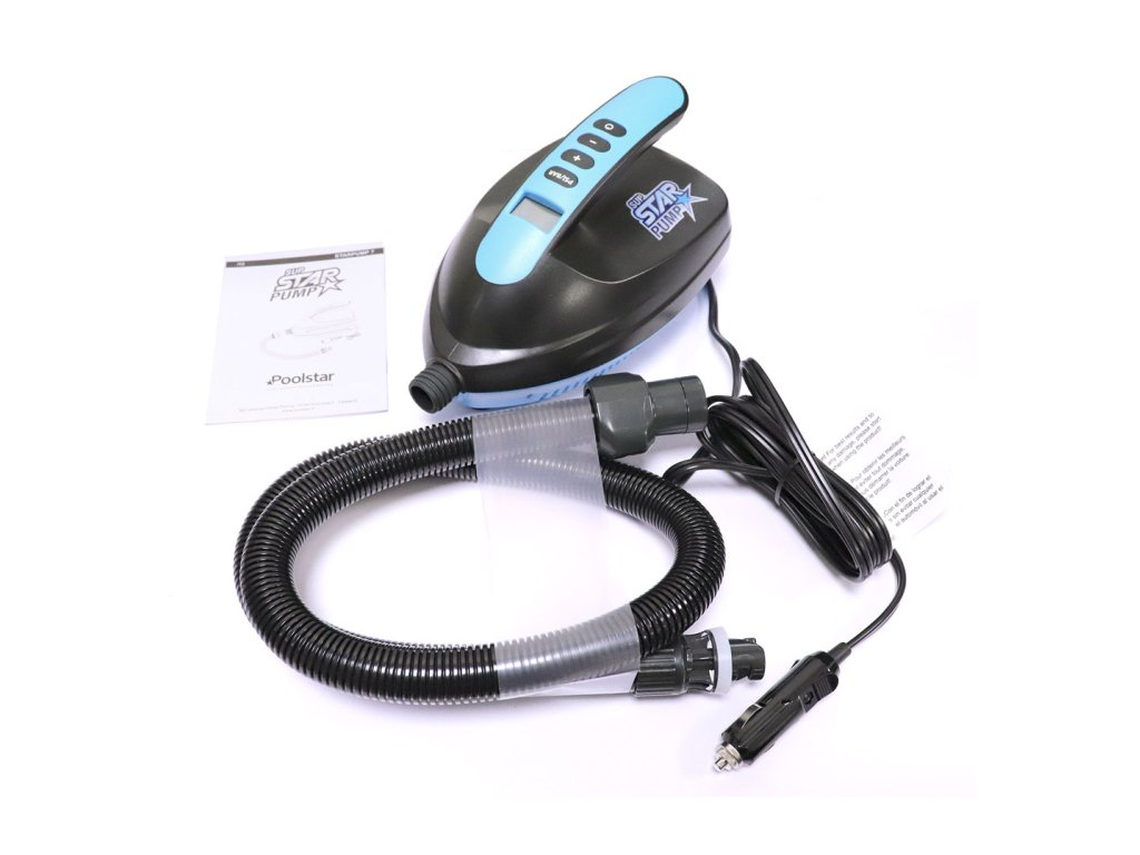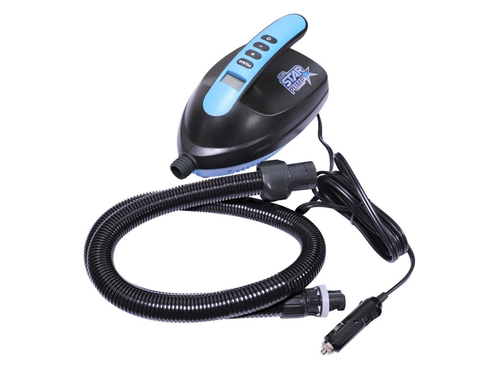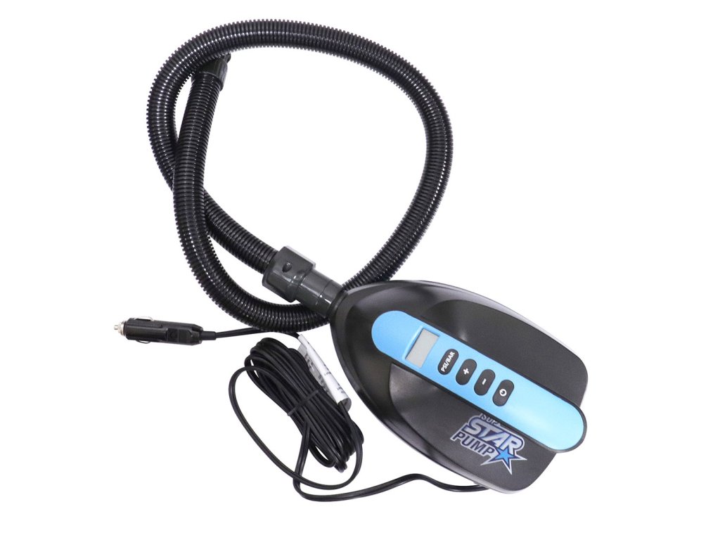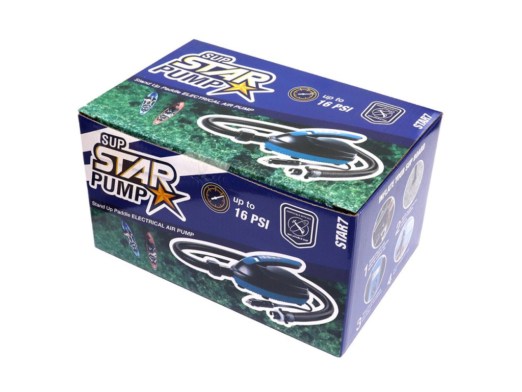 Elektrická pumpa SUP Star Pump určená k nafukování paddleboardů. Napájení zajišťuje klasická autozásuvka (cigaretní autozásuvka) na 12V. Na těle pumpy se nachází LCD displej a tlačítka, pomocí kterých nastavíme požadovaný tlak, který se poté zobrazuje na displeji pumpy. Když pumpa dosáhne nastaveného tlaku, automaticky se vypne.