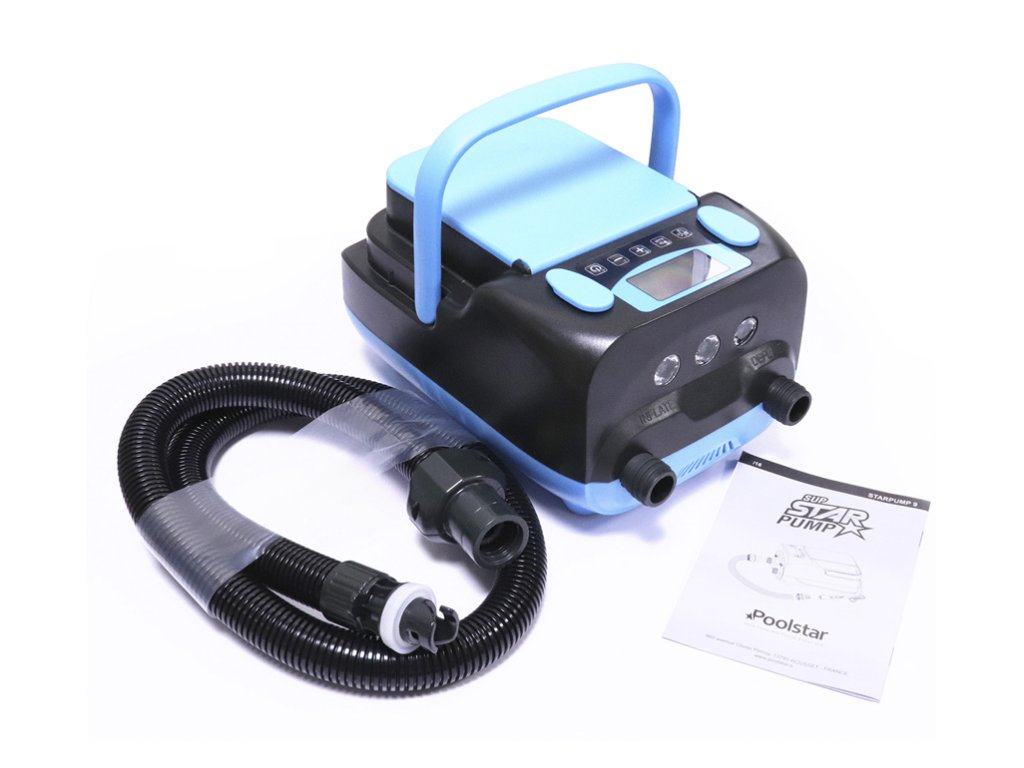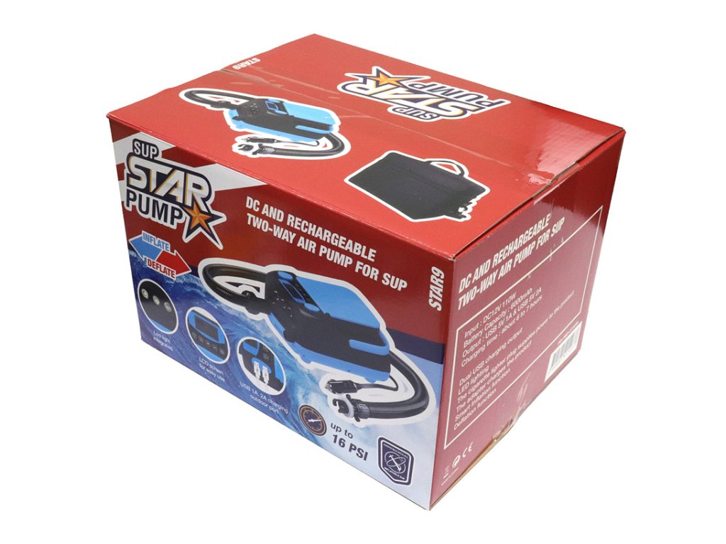 Elektrická bateriová pumpa SUP Star Pump je ideální pro nafukování i vyfukování paddleboardů. Tato pumpa má vestavěnou baterii s kapacitou 6 000 mAh, která zvládne nafouknout 5 – 7 standardních paddleboardů. Můžete ji používat k nafukování nebo vyfukování paddleboardů pomocí integrované baterie nebo přes standardní autozásuvku (cigaretní autozásuvku) na 12V. Zdroj napájení pro běžnou zásuvku 220V slouží pouze k nabíjení vestavěné baterie. Na těle pumpy se nachází LCD displej a tlačítka pro nastavení požadovaného tlaku, který se pak zobrazuje na displeji pumpy. Pumpa také na displeji ukazuje aktuální stav nabití baterie v procentech. Když pumpa dosáhne nastaveného tlaku, automaticky se vypne.